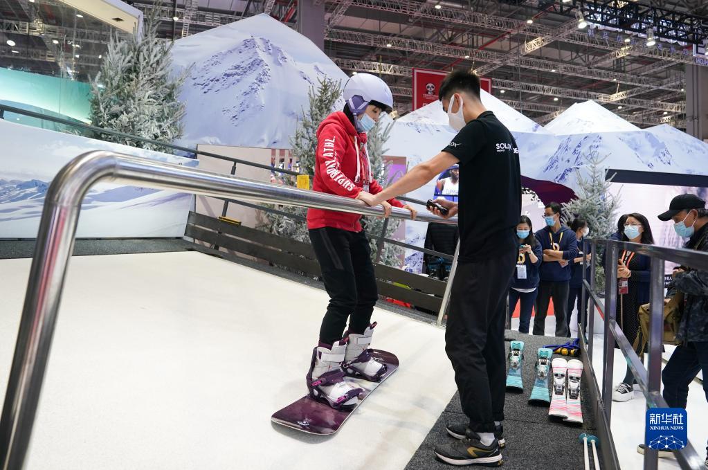 2021年11月5日,參觀者在進博會消費品展區的一家展臺體驗滑雪。新華社記者 丁汀 攝