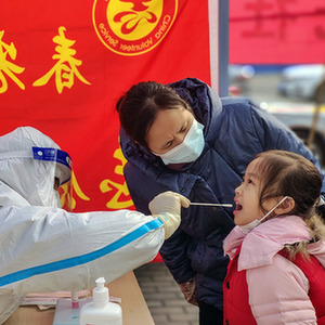在安陽(yáng)市文峰區(qū)紫薇大道街道春光路社區(qū),醫(yī)護(hù)人員為一名小朋友進(jìn)行核酸檢測(cè)取樣(1月11日 麻翛然攝)