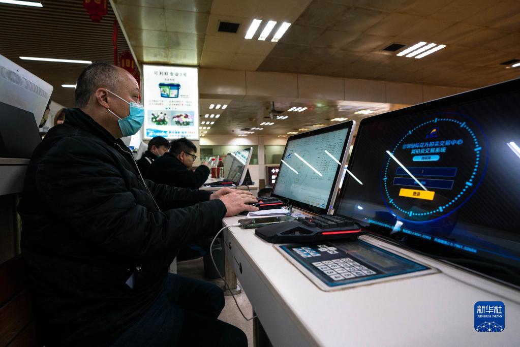1月21日,花商馬金科在昆明國際花卉拍賣交易中心內競拍鮮花。新華社記者 王冠森 攝