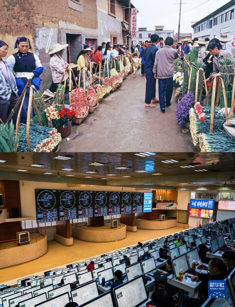 拼版照片:上圖為1994年顧客在斗南村購買鮮花(資料照片);下圖為2022年1月21日,花商在昆明國際花卉拍賣交易中心內競拍鮮花(新華社記者王冠森攝)。新華社發