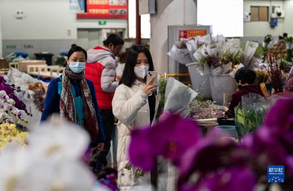 1月21日,花商畢茜茜在花攤直播銷售鮮花。新華社記者 王冠森 攝