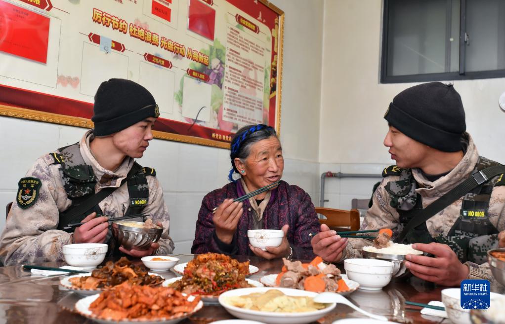 次仁曲珍老人在哨所與戰士一起吃飯時,講述過去送菜的經歷(1月27日攝)。新華社記者 覺果 攝