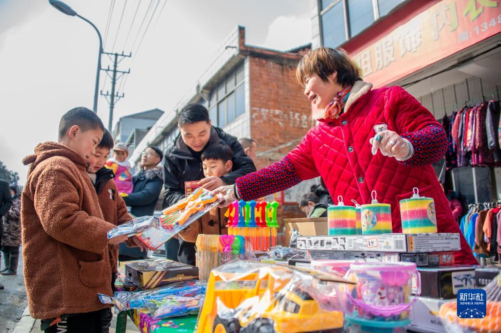 1月29日,小朋友在湖北省隨縣柳林鎮街頭的一個玩具攤前選購玩具。新華社發(伍志尊 攝)