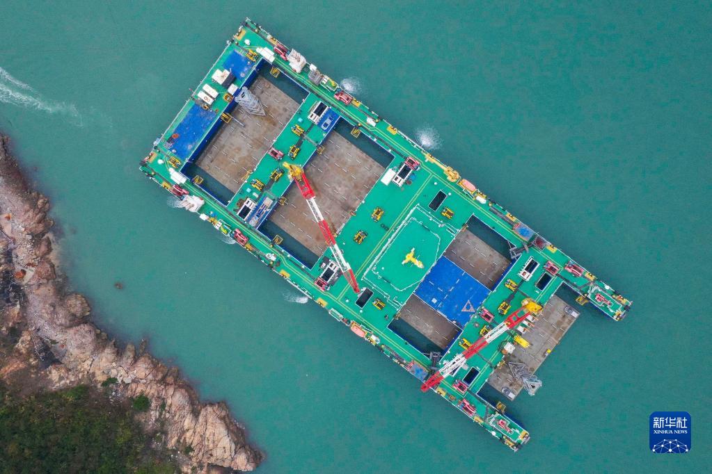1月14日,中交一航局的“一航津安1”號沉管運輸安裝一體船搭載E16管節準備浮運前往珠江口伶仃洋安裝現場(無人機照片)。新華社記者 劉大偉 攝