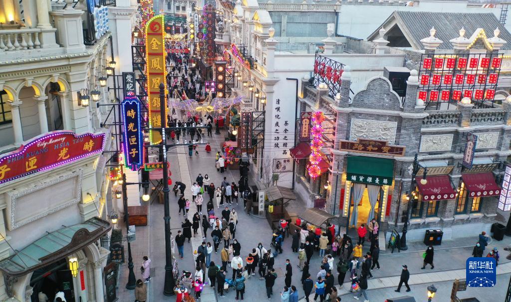 2月5日,游客在河南鄭州建業·華誼兄弟電影小鎮游覽(無人機照片)。新華社記者 張浩然 攝