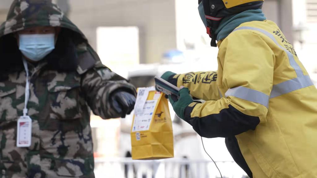 2月20日,內蒙古呼和浩特市的外賣騎手將餐食交給疫情防控工作者。新華社記者達日罕 攝