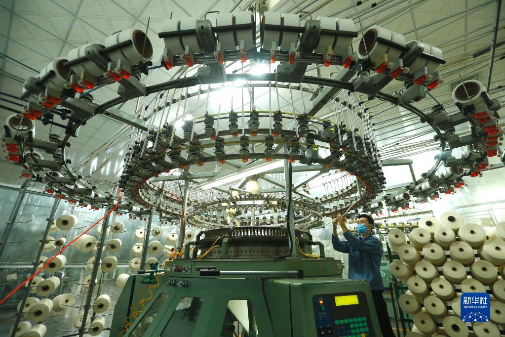 江蘇省泰州市海陵區一家公司的紡織工人在生產一線作業(2月7日攝)。新華社發(湯德宏攝)