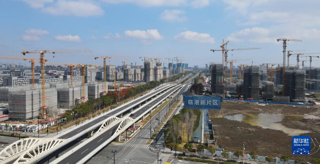 2月10日在中國(上海)自由貿易試驗區臨港新片區拍攝的住宅區建設現場(無人機照片)。新華社記者 方喆 攝