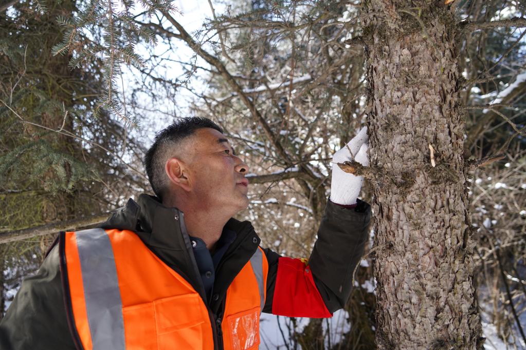 圖為2月20日,在青海省海東市的上北山林場,護林員趙以成正在觀察樹木長勢。 新華社記者 耿輝凰 攝