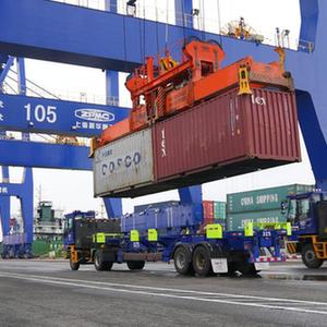 圖為2月21日下午,在洋浦國際集裝箱碼頭內,工作人員正引導貨車轉運集裝箱。該碼頭是海南自貿港建設的重要集裝箱航運樞紐。 新華社記者 王軍鋒 攝