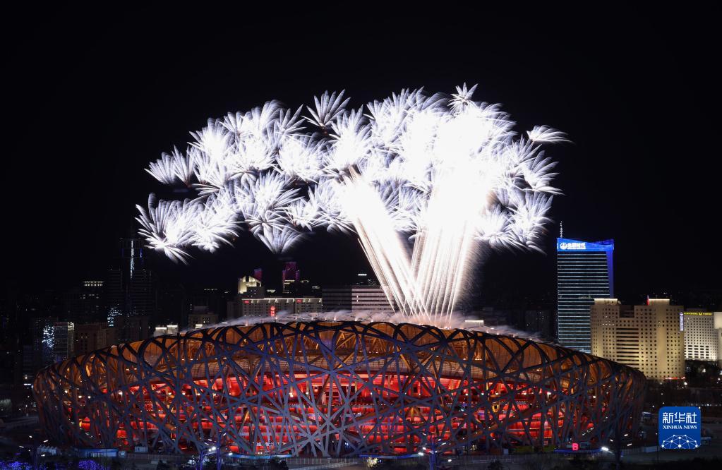在第二十四屆冬季奧林匹克運(yùn)動會開幕式上,焰火綻放在北京國家體育場上空(2022年2月4日攝)。新華社記者 盧燁 攝