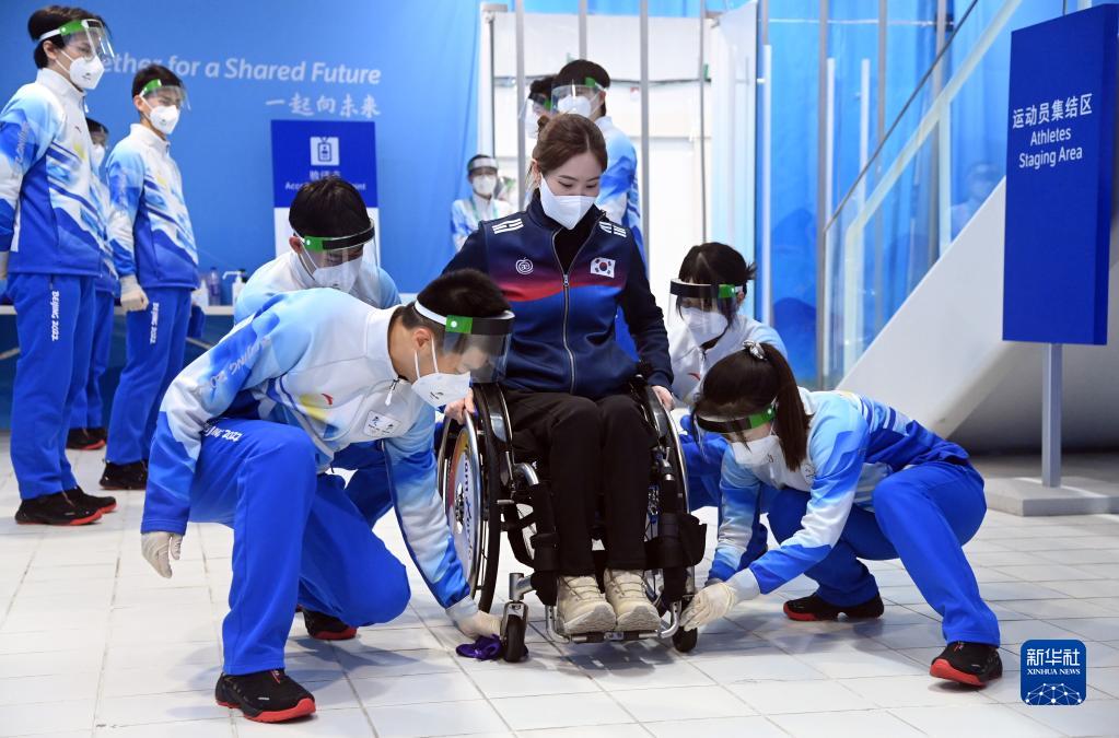在國家游泳中心“冰立方”舉行的北京2022年冬殘奧會輪椅冰壺比賽前,志愿者們?yōu)轫n國選手白慧珍清潔輪椅(2022年3月6日攝)。新華社記者 任超 攝
