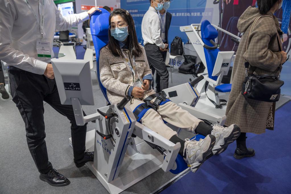 2021年10月16日,觀眾在中國國際福祉博覽會上體驗一款智能物聯(lián)網(wǎng)長者運動康復(fù)系統(tǒng)。新華社記者 才揚 攝