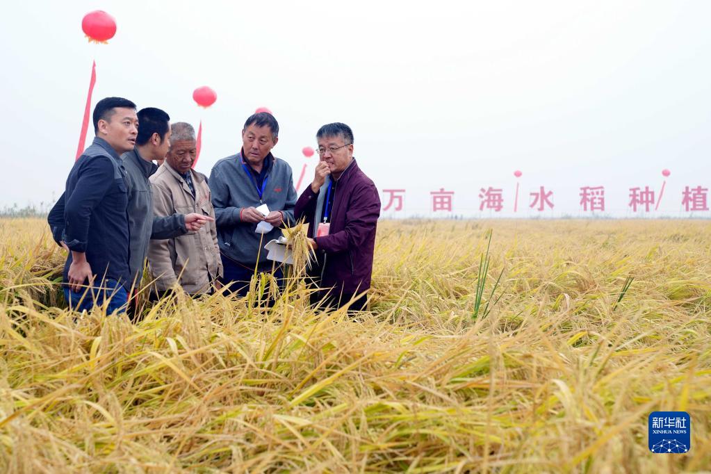 在山東濰坊市寒亭區海水稻三產融合示范基地,專家組成員在進行測產(2020年10月16日攝)。 新華社記者 郭緒雷 攝