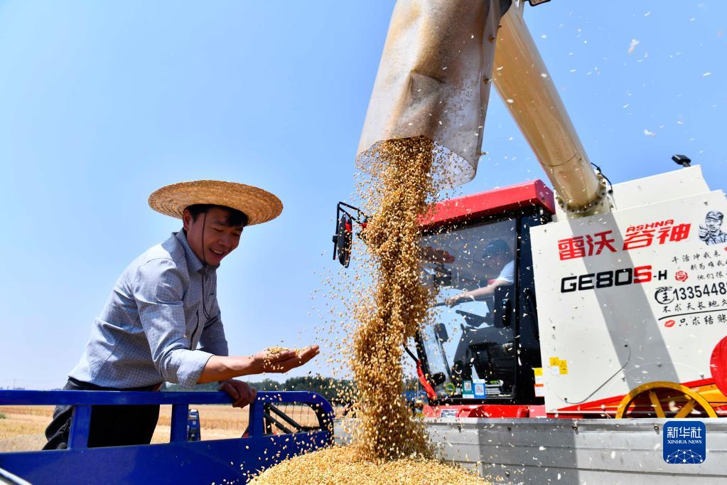 在山東滕州市官橋鎮,農民查看新收獲小麥的質量情況(2021年6月4日攝)。 新華社記者 郭緒雷 攝