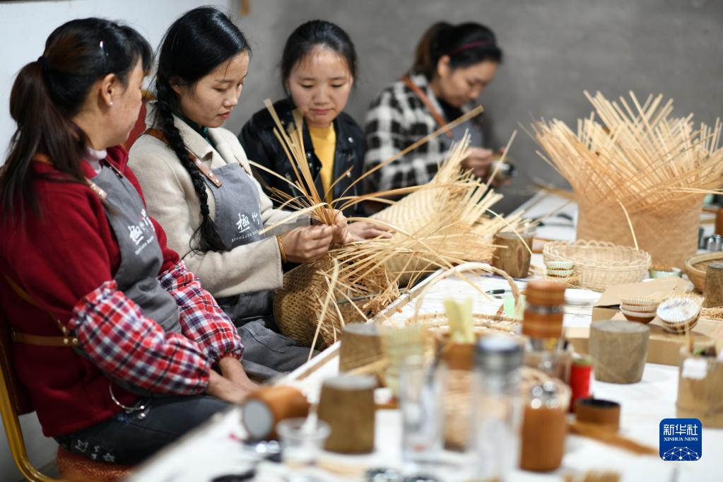 楊昌芹(左二)在非遺“赤水竹編”培訓(xùn)基地指導(dǎo)工人學(xué)習(xí)竹編(2019年11月11日攝)。新華社記者 楊文斌 攝