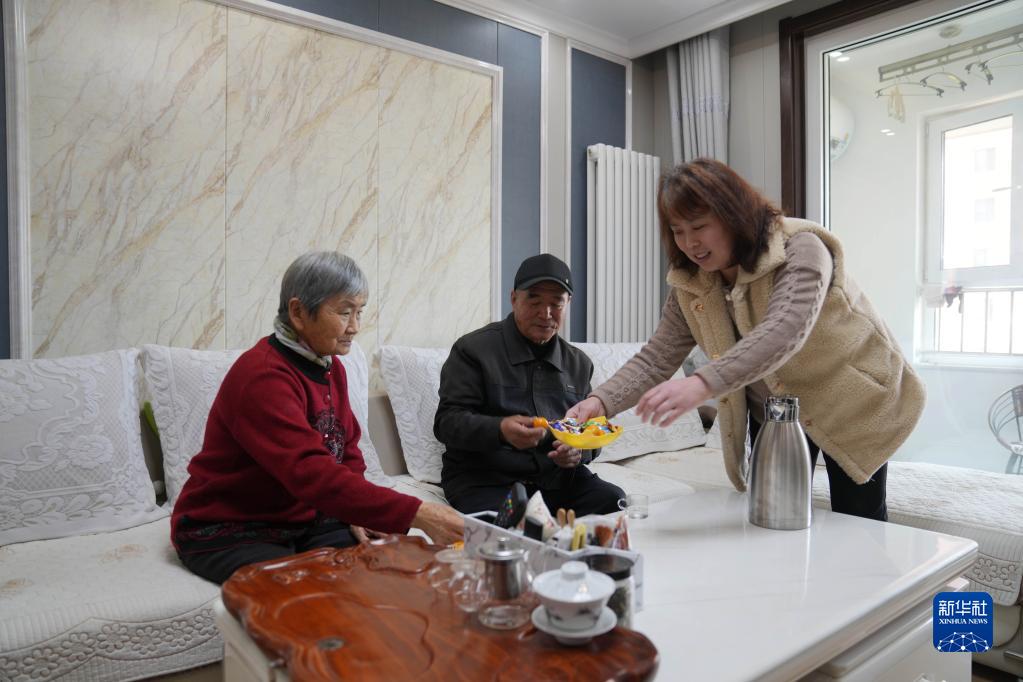 山東省濟南市長清區孝里街道居民于家云(中)、朱存紅夫婦和兒媳婦安風芹(右)在遷入的新居中(4月8日攝)。新華社記者朱崢攝