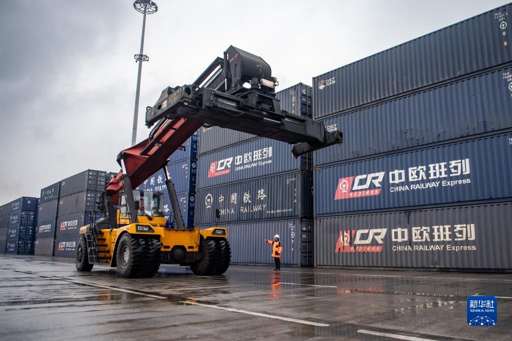 中歐班列起點聯合巡邏隊成員在重慶團結村中心站貨場對作業車輛進行現場指揮(1月25日攝)。新華社記者 唐奕 攝