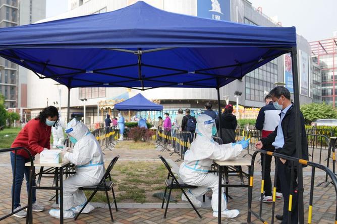 4月29日,在北京市朝陽區(qū)八里莊街道新城市廣場核酸采樣點,工作人員為前來參加檢測的市民登記信息。當日,北京市朝陽區(qū)開展第三次擴大范圍核酸檢測。(新華社記者 鞠煥宗 攝)