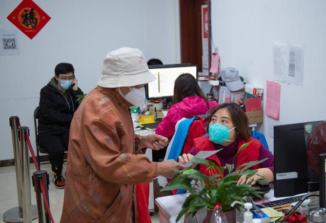 4月28日,在北京市朝陽區(qū)和平村一社區(qū)居委會辦公室,工作人員王夏琳(前右)為一名有外出就醫(yī)需求的老人辦理相關手續(xù)。(新華社記者 陳鐘昊 攝)