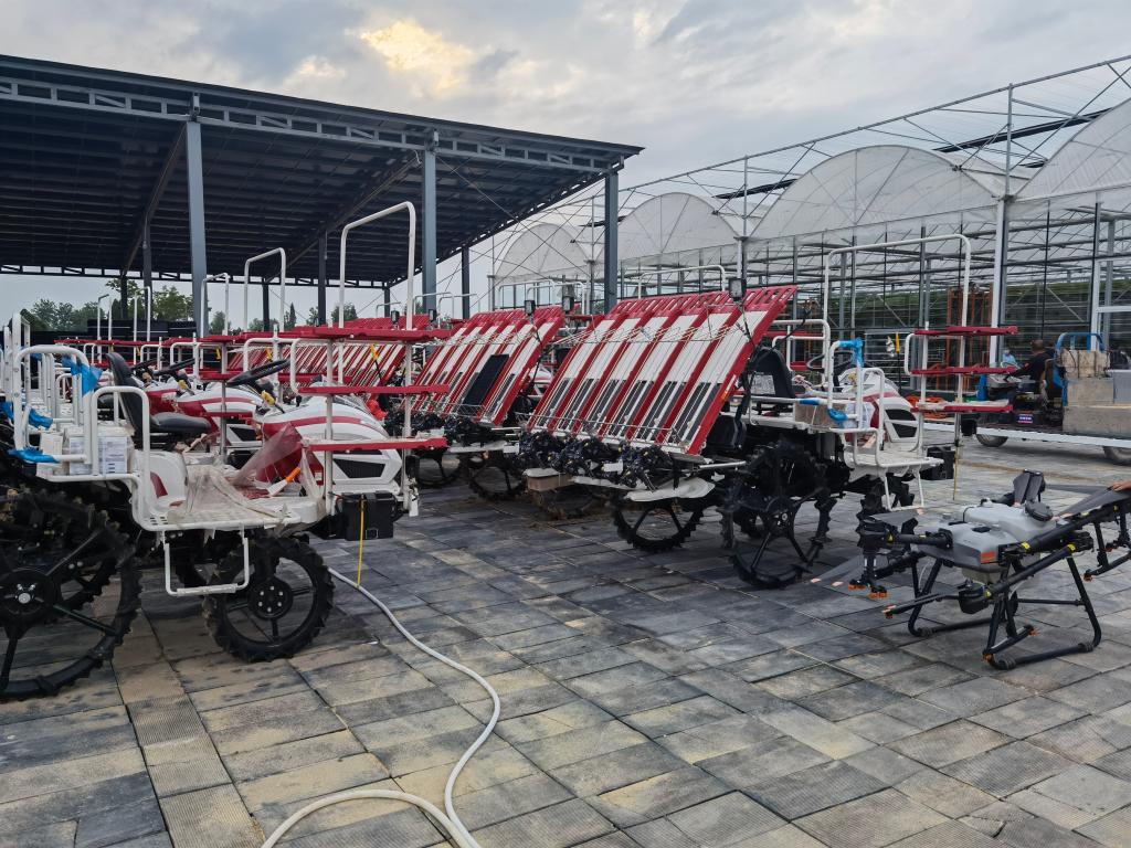 育秧中心棚前停放著的插秧機。(新華社記者張健 攝)