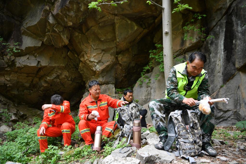 趙蒼虎(右一)與同事在山間休息。(新華社記者張博文 攝)