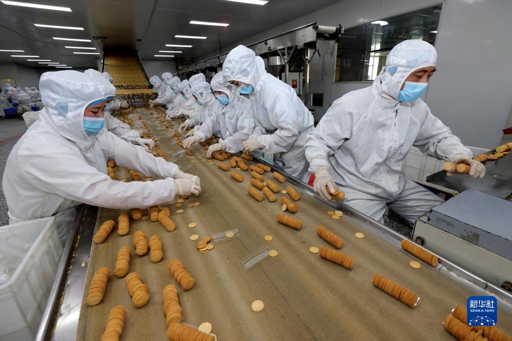 4月30日,山東省棗莊市孟莊鎮一家食品企業的工人在包裝餅干。新華社發(孫中喆 攝)