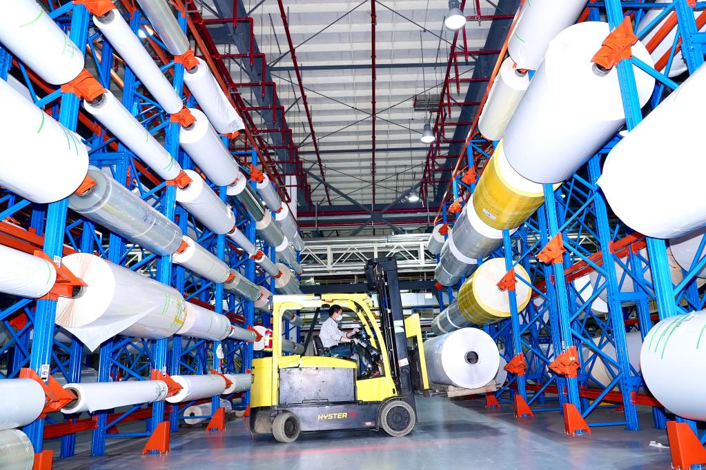 艾利丹尼森(中國)有限公司車間里,工人正在裝卸產(chǎn)品。(昆山市融媒體中心供圖)