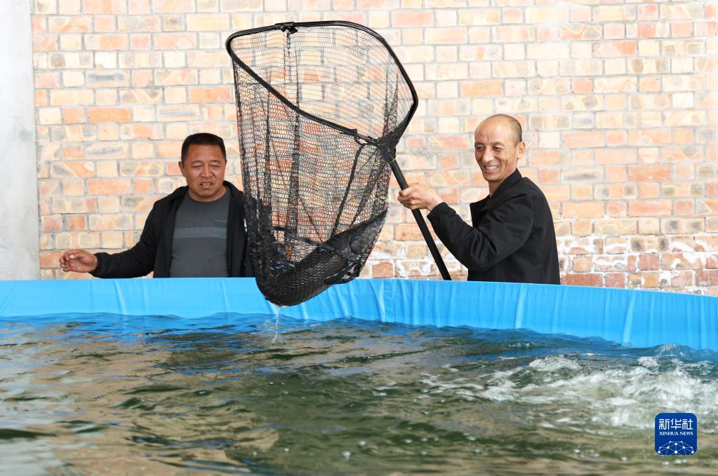 寧夏固原市原州區姚磨村種植大戶姚選(右)在“種養結合”大棚里撈魚(4月19日攝)。新華社記者 盧鷹 攝