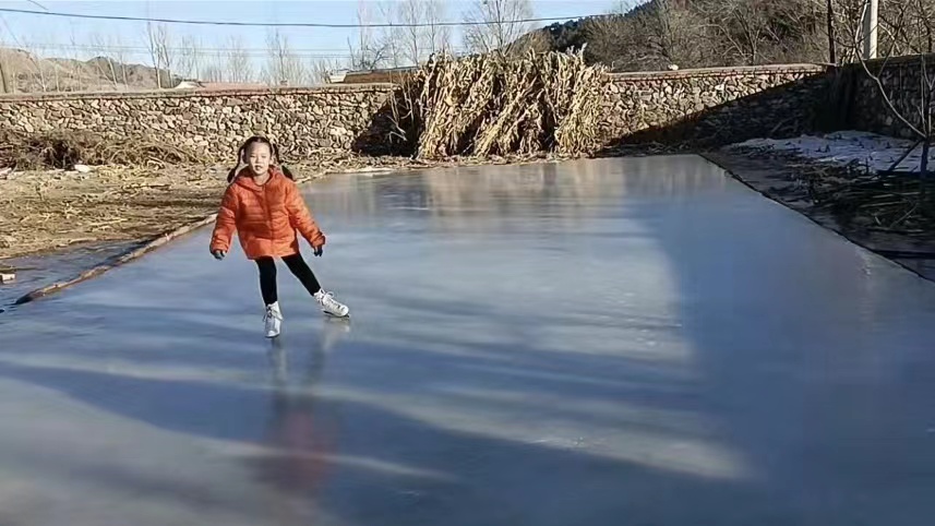 艾國鵬在村里自制了一座冰場
