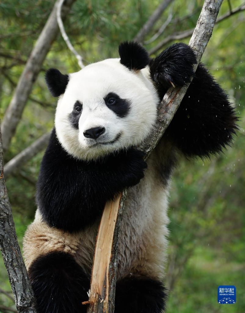 大熊貓“善仔”在陜西洋縣華陽鎮“秦嶺四寶園”熊貓谷爬樹(4月18日攝)。新華社記者 邵瑞 攝