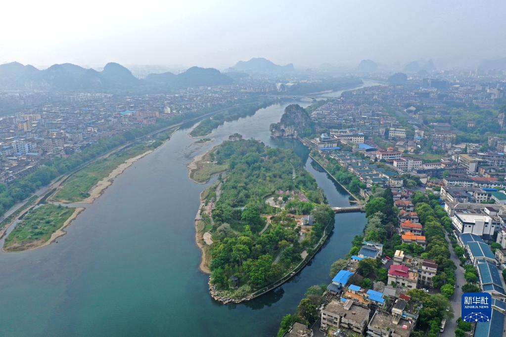 生態修復改造后的漓江伏龍洲景色(4月10日攝,無人機照片)。新華社記者 周華 攝