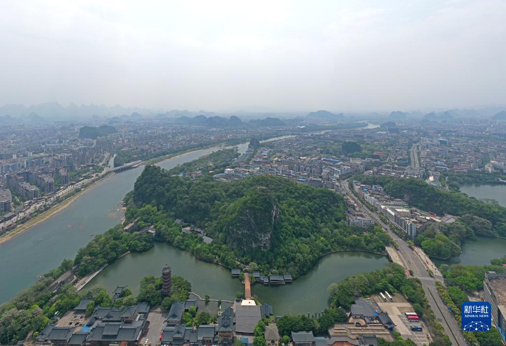 漓江沿岸木龍湖及建設中的古宋城街區(4月10日攝,無人機照片)。新華社記者 周華 攝