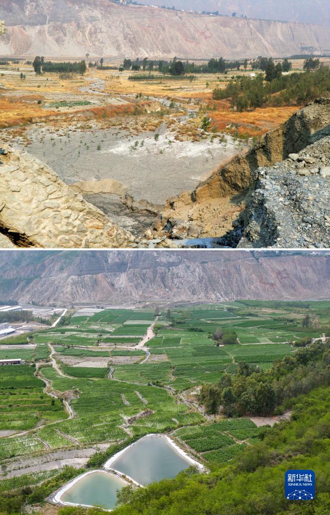 這是一張拼版照片,上圖為:2013年蔣家溝出口段附近發生泥石流后的景象(資料照片);下圖為:蔣家溝出口段附近生態修復治理后的景象(6月1日攝,無人機照片)。新華社記者 胡超 攝