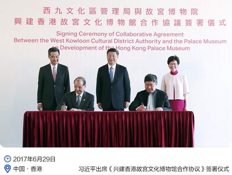 2017年6月29日,習近平主席抵達香港當天,便風塵仆仆前往西九文化區考察,見證西九文化區管理局和故宮博物院簽署《興建香港故宮文化博物館合作協議》。