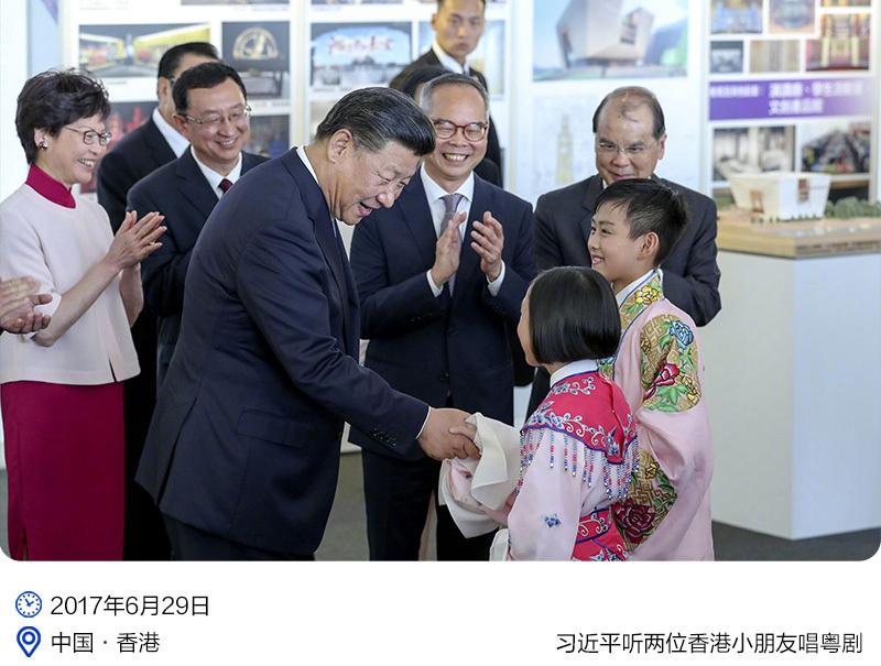 2017年香港之行,習近平主席在西九文化區觀看了兩名兒童演唱粵劇選段,稱贊他們年紀雖小,但演唱很到位。“很高興看到你們這么喜歡粵劇,這說明香港粵劇后繼有人,也說明中華優秀傳統文化具有頑強生命力。”習近平主席表示,“希望大家珍惜機遇,勤學苦練,多同內地同行交流切磋,為廣大粵劇愛好者奉獻精彩演出,為傳承中華優秀傳統文化作出自己的貢獻。”