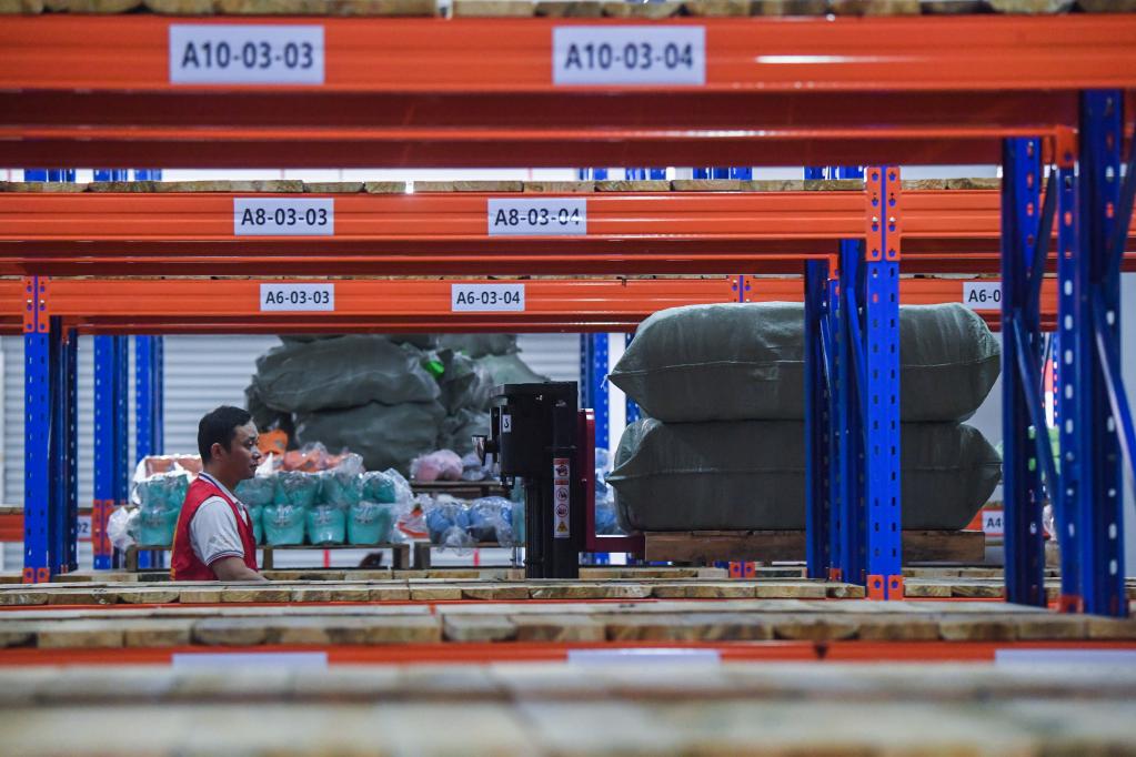 6月27日,在義烏市蘇溪鎮愛德瑪電商園的“小眾云倉”站點內,工作人員在搬運等待發貨的電商貨物。新華社記者徐昱 攝