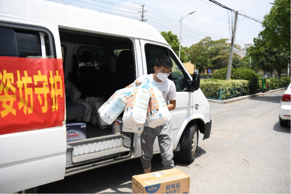 7月3日,在泗縣虹鄉(xiāng)家園小區(qū),“小區(qū)長”孟軍為小區(qū)居民配送生活物資。新華社記者黃博涵 攝