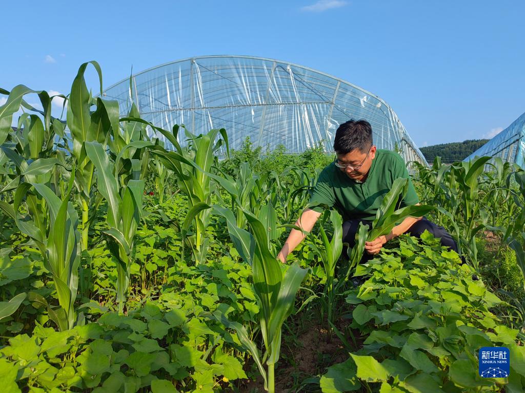 在吉林省梨樹縣泉眼溝村,宏旺農機農民專業合作社理事長張文鏑在田里查看不同種植方式的作物長勢(2022年7月5日攝)。新華社記者 薛欽峰 攝