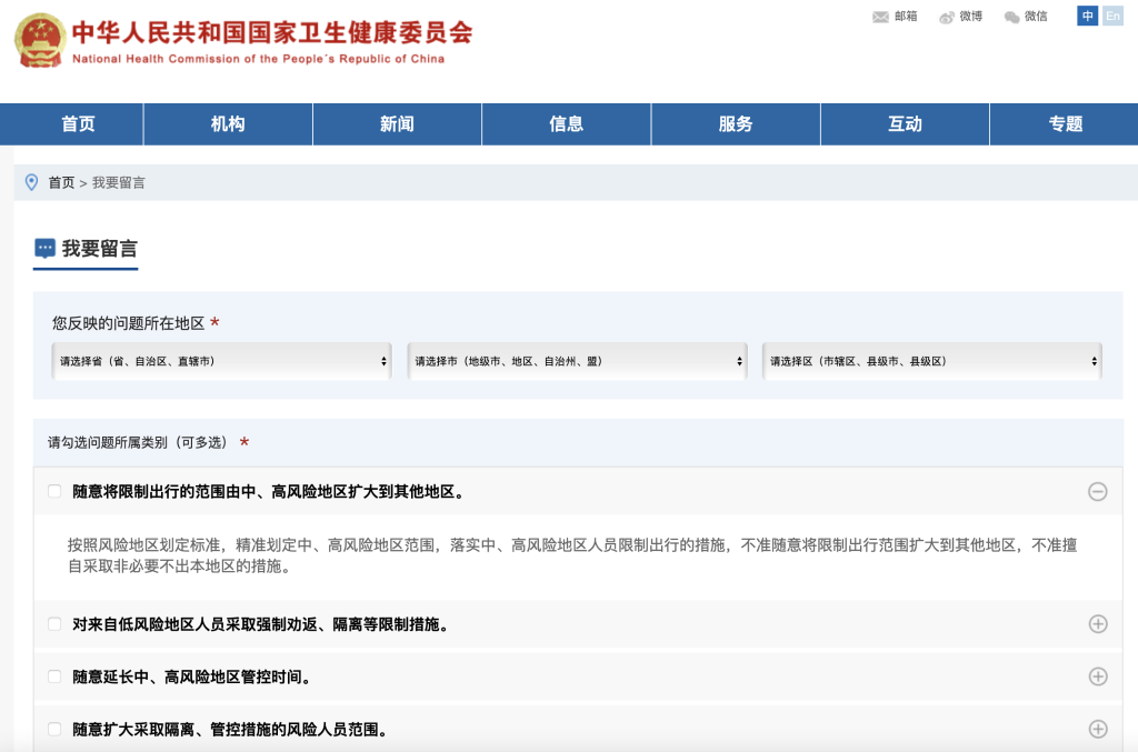 國家衛(wèi)生健康委疫情防控“九不準”公眾留言板留言界面截圖