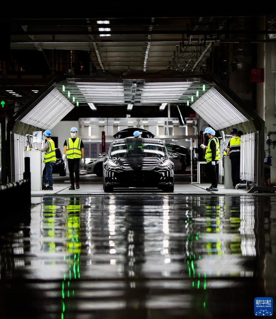工作人員在特斯拉上海超級(jí)工廠內(nèi)作業(yè)(2020年11月20日攝)。新華社記者 丁汀 攝