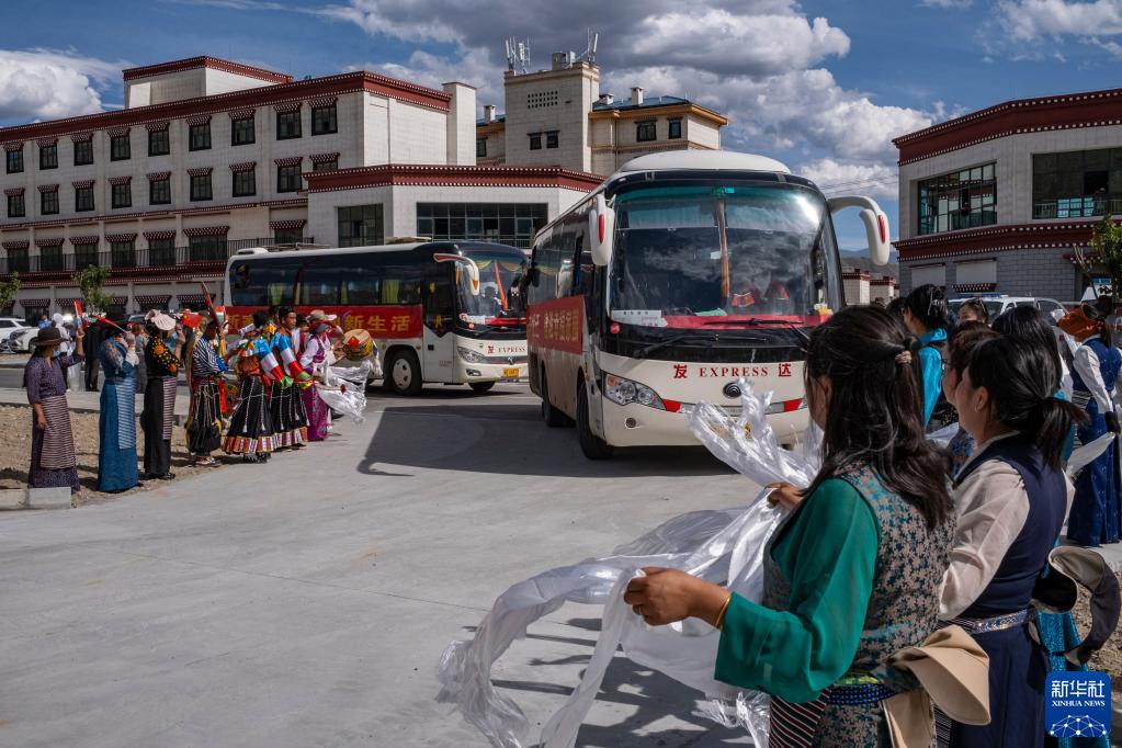 在森布日安置點(diǎn),西藏山南市貢嘎縣的群眾歡迎遠(yuǎn)道而來的搬遷群眾(7月19日攝)。新華社記者 孫非 攝