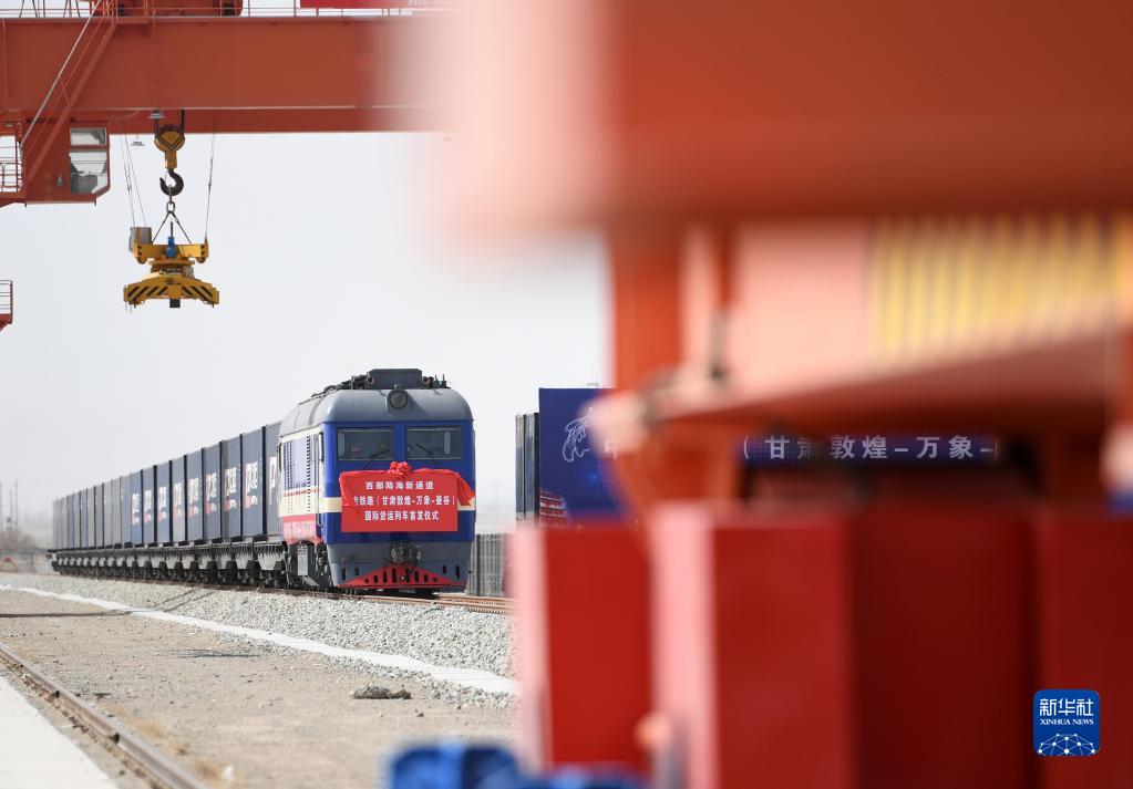 2022年4月21日,甘肅首趟中老鐵路國際貨運列車在敦煌市鐵路西貨站綜合貨場等待發車。新華社記者 陳斌 攝