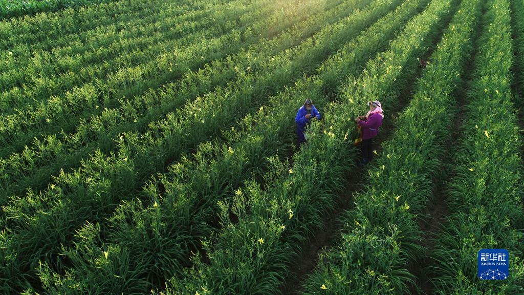 農戶在寧夏吳忠市紅寺堡區柳泉鄉黃花菜基地采摘黃花菜(2022年7月5日攝,無人機照片)。新華社記者 王鵬 攝