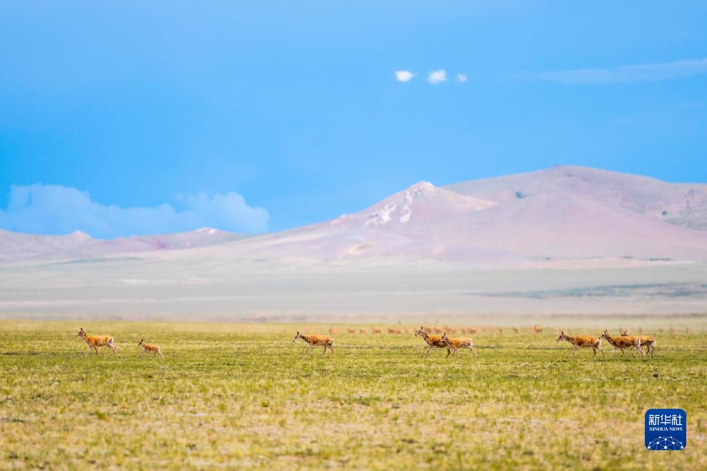 在西藏自治區北部的羌塘國家級自然保護區,藏羚羊在草原上奔跑(2022年7月11日攝)。新華社記者 周荻瀟 攝