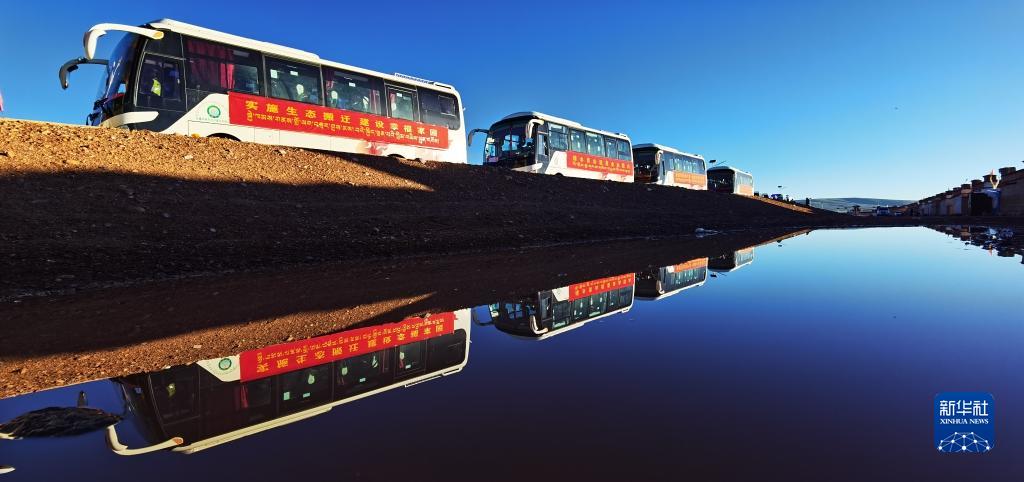 在西藏那曲市雙湖縣多瑪鄉拍攝的整裝待發的車隊,客車載著牧民前往位于山南市貢嘎縣的森布日安置點(2022年7月19日攝)。新華社記者 沈虹冰 攝