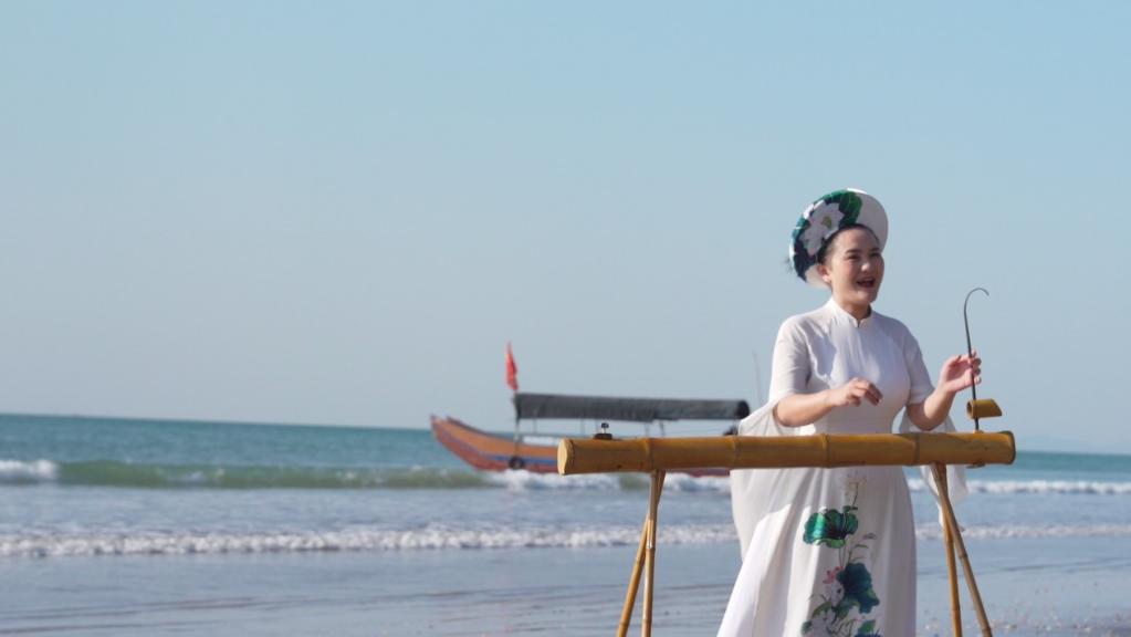 趙霞在廣西東興市金灘海邊進行京族獨弦琴表演。(受訪者供圖)