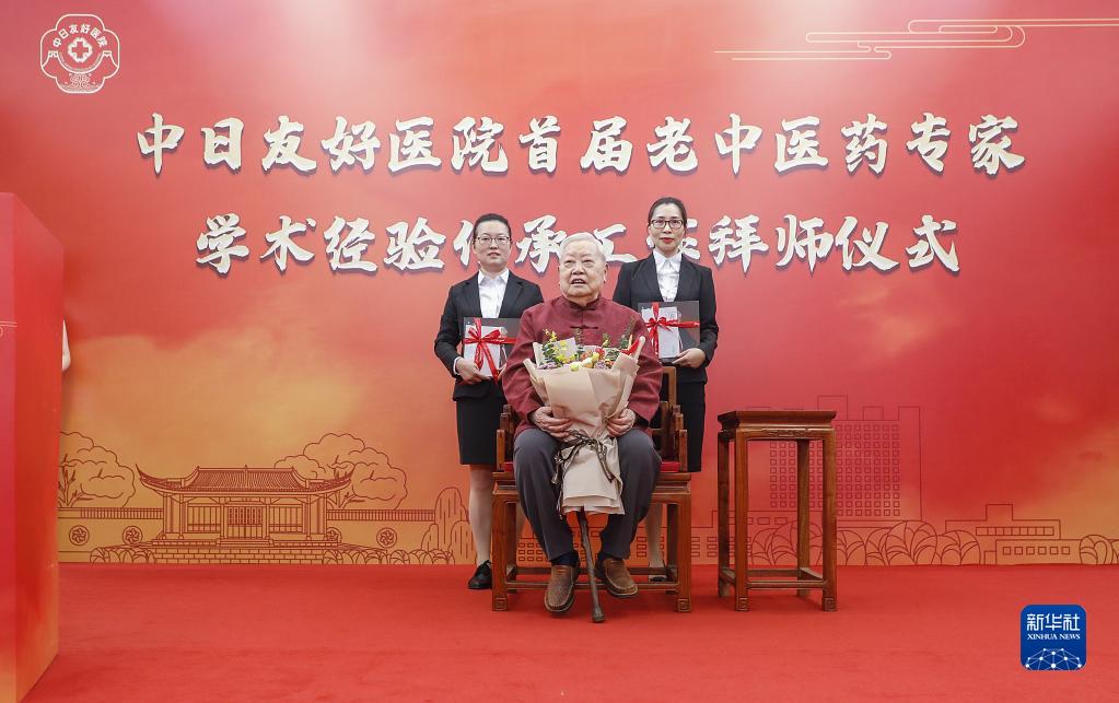 2021年9月16日,中日友好醫院在北京舉行首屆老中醫藥專家學術經驗傳承工作拜師儀式。國醫大師許潤三和傳承人在拜師儀式上合影。新華社記者 張玉薇 攝