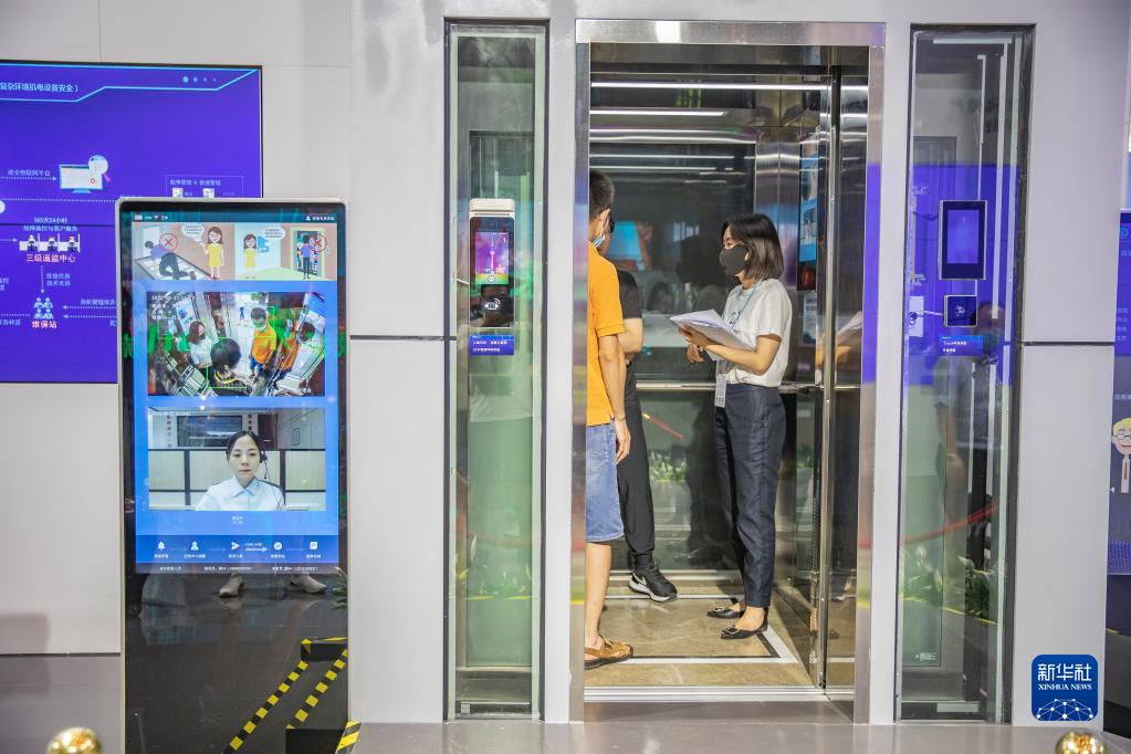 8月21日,在2022智博會重慶館內,工作人員帶媒體記者體驗智慧電梯的實時可視化救援服務。新華社記者 黃偉 攝