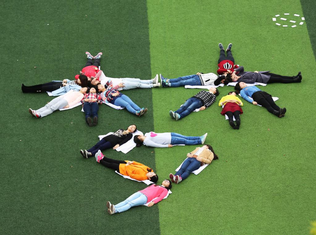 圖為湖南南華大學護理學院的志愿者在學校足球場舉行“睡入夢鄉”行為藝術